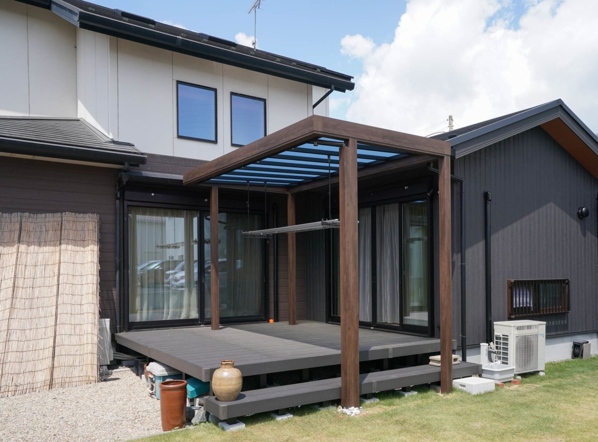 また、その隣には『三協アルミ・クロススタイル』『YKKap・リウッドデッキ200』を使用して、テラス屋根付きのウッドデッキも設置しています。