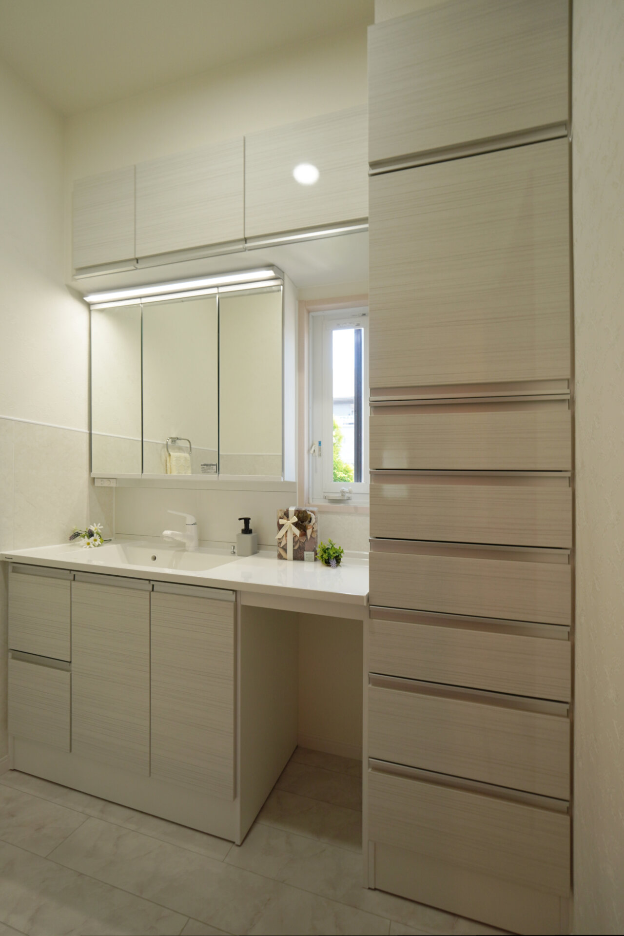 洗面台は引き出し2段+両開き収納を組み合わせた仕様で、右横にはゴミ箱やスツールを置けるスペースを確保しています。