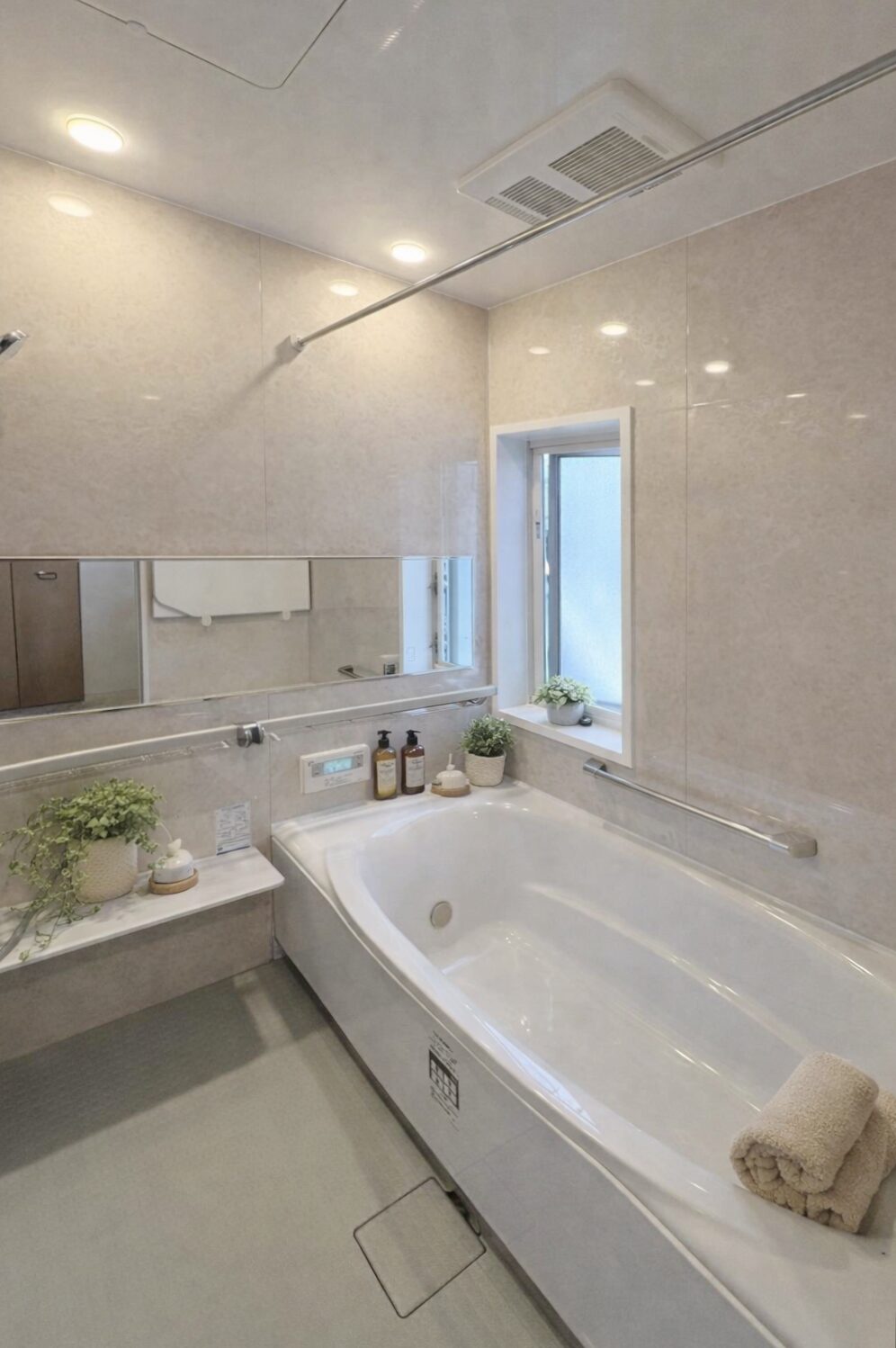 浴室パネルは、通常は1面のみアクセントパネルに変更するケースが多いですが、今回は4面変更しても金額が変わらないキャンペーンを実施していたため、すべての面にマーフィルベージュを採用しました。