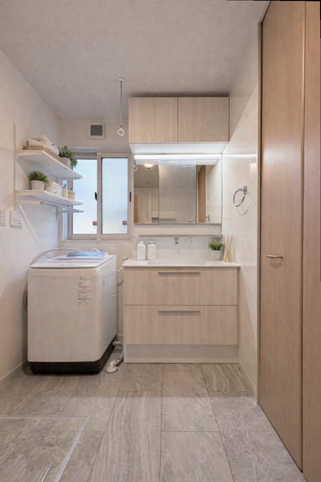 また、洗面所は腰壁を撤去して広々とした空間に整え、収納や室内物干しを設置することで、より使い勝手の良い洗面所に生まれ変わりました。