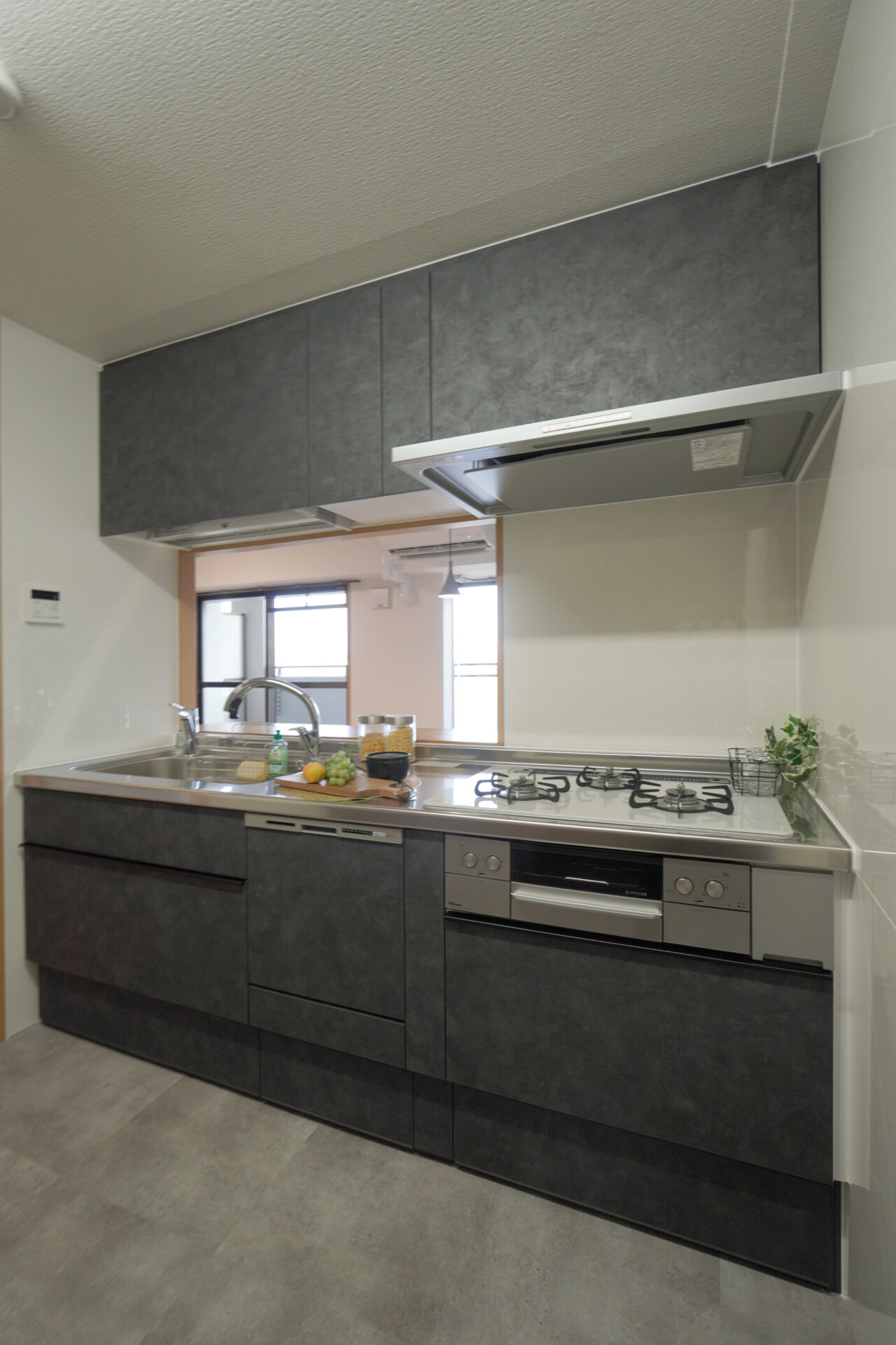扉カラーは黒系のディープグレーで、空間全体をスタイリッシュな印象に仕上げました。