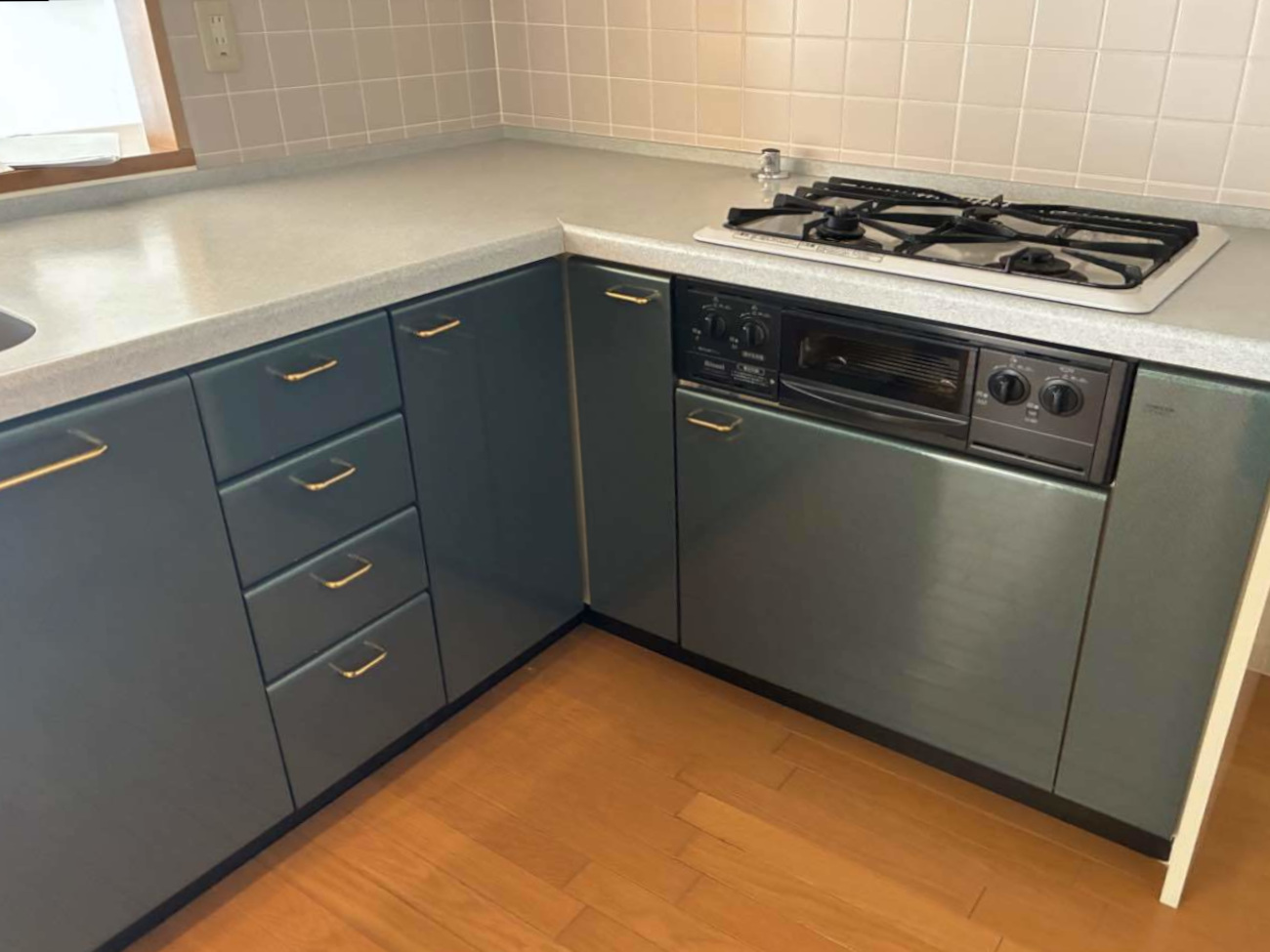 キッチン周りの壁はタイル貼り、床はフローリングです。