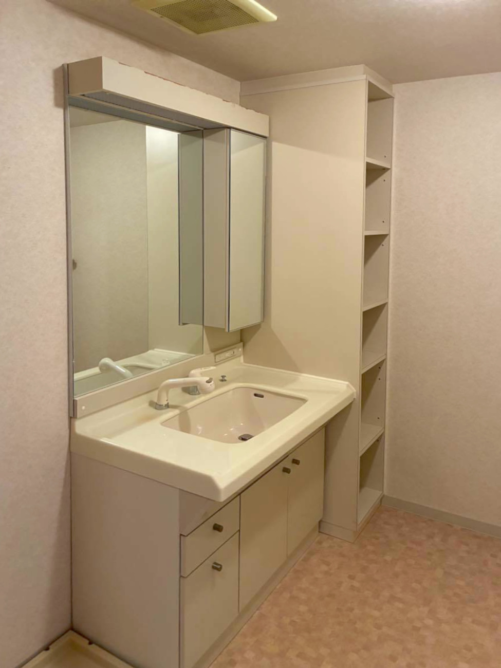 なお、洗面台横の収納棚は既存のものをそのまま活用しています。